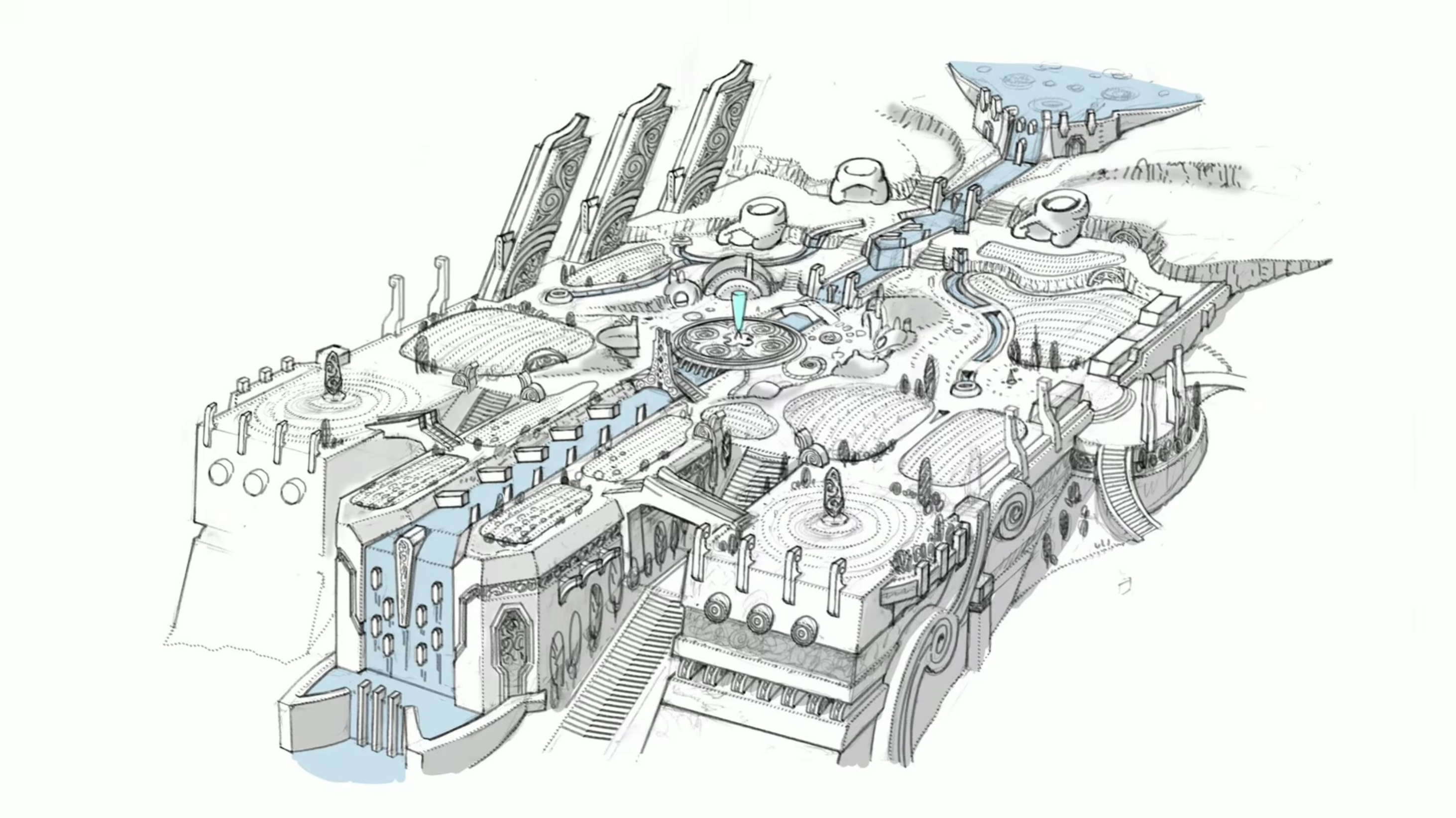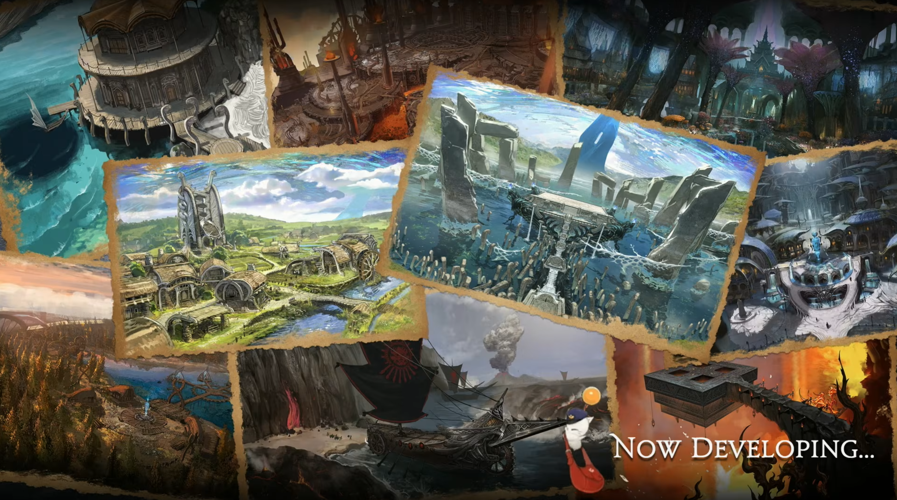 基調講演では溶岩が流れる工業地帯、穀倉地帯、森林、湖、荘厳な門、巨大魔法生物(Arcane Giants)など多数のイメージボードが公開された。
