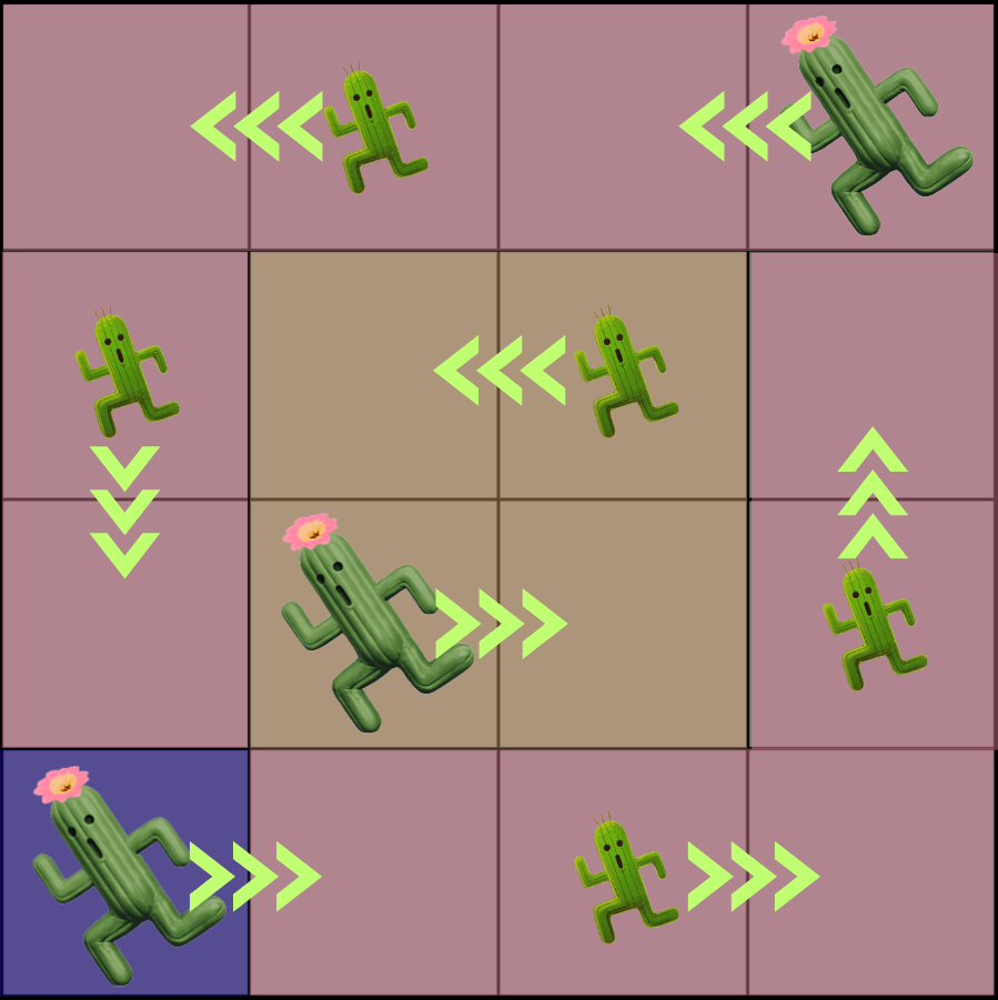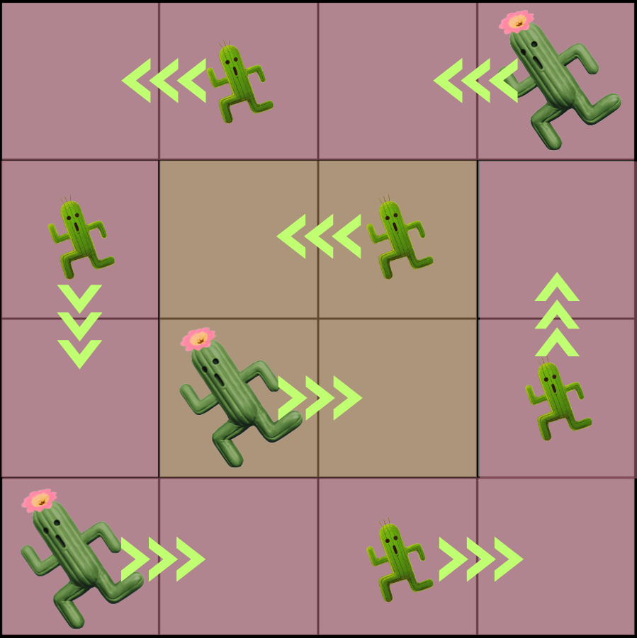- 外周大サボテンの進行方向と逆2マスのどちらかが安置