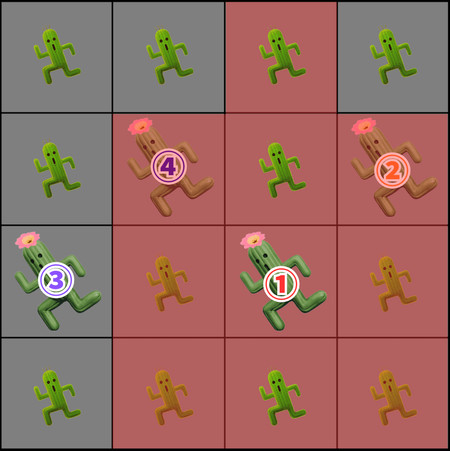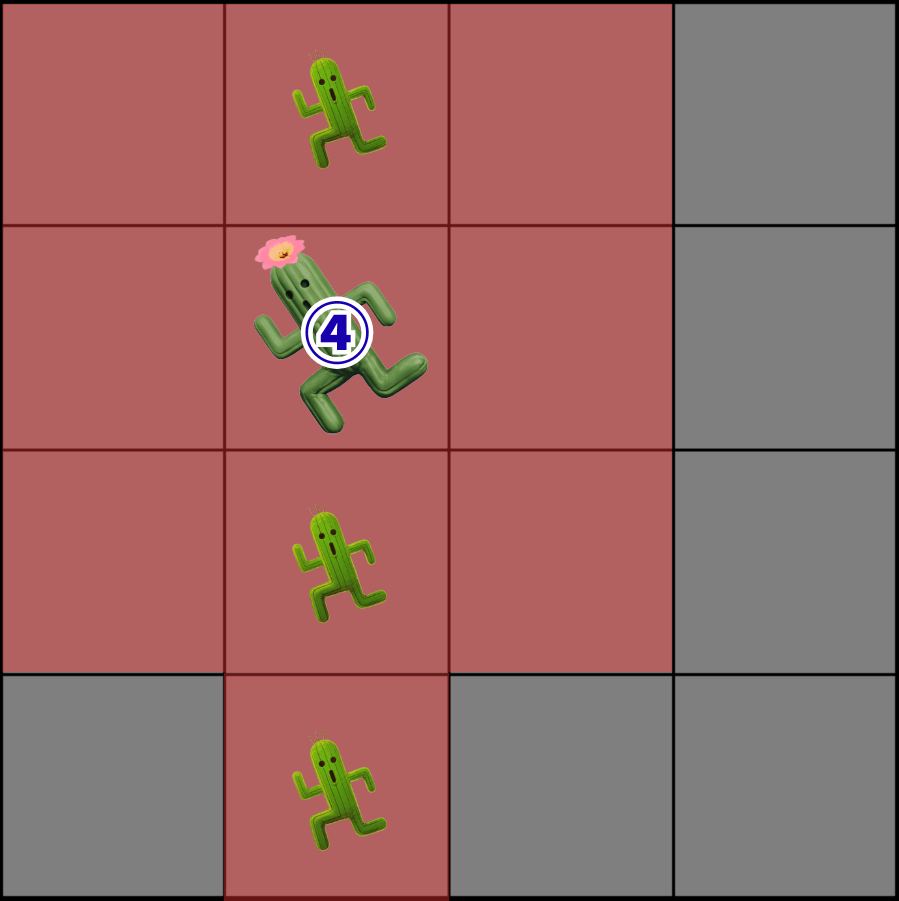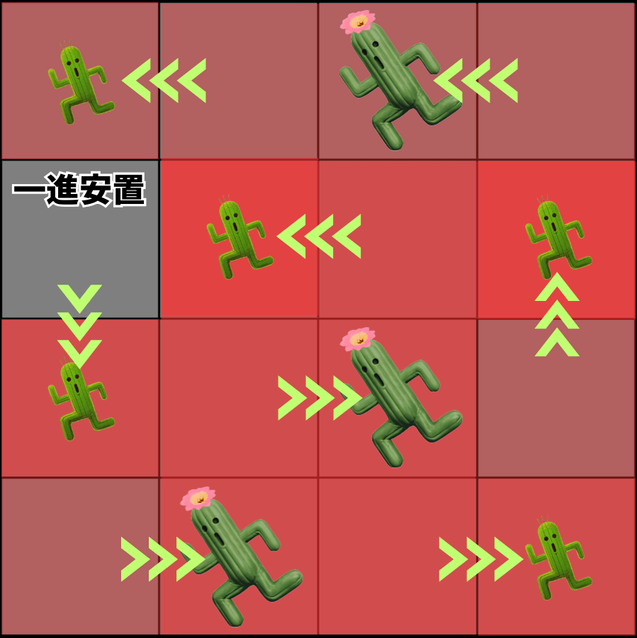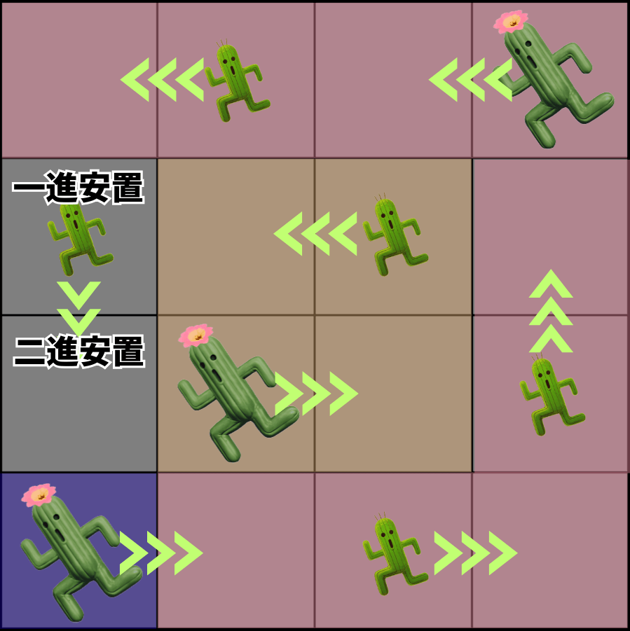 サボテンが1マス飛ばしで配置される都合上、一進ならば小サボテンがいたマスと考えるとわかりやすい。