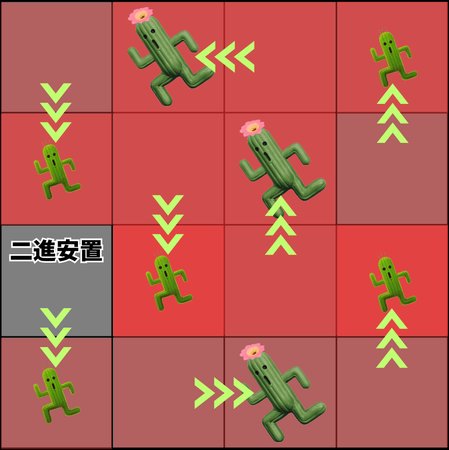 - 一進なら小サボテンのいるマス/二進だと空きマスが安置