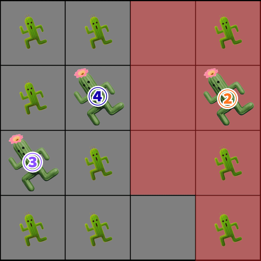 今回のケースなら左下外周の大サボテンを対象として、そこから進行方向と逆の外周2マスが一進&二進の安置になる。