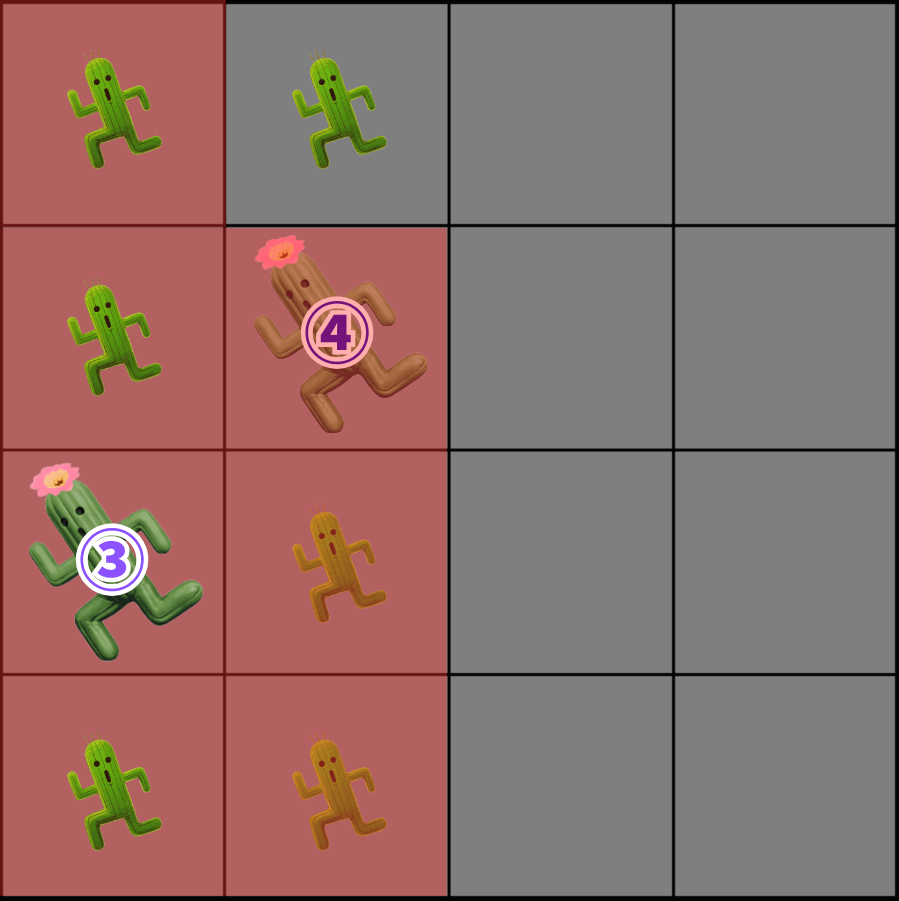 大サボテンは縦一列につき1体なので、3~4番目の縦列安置→1番目縦列発動で駆け込み回避。