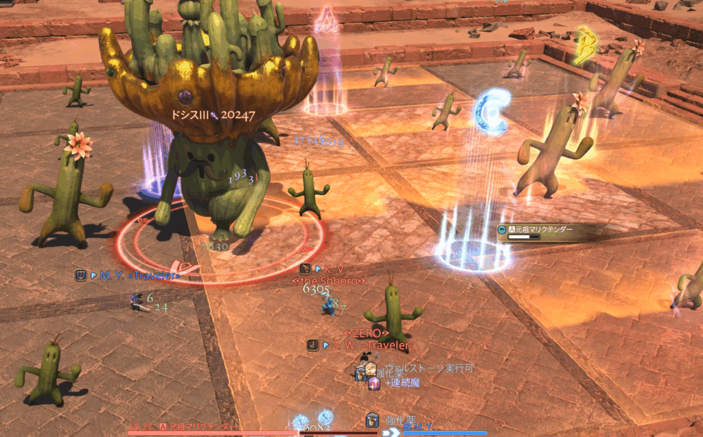 株分け1回目の大小サボテンダーAoEの応用ギミック。配置されたサボテンダーたちが1マスor2マス移動→AoE発動という流れで、法則上安置はいずれも1マスのみ。