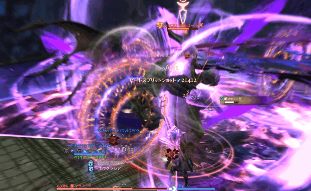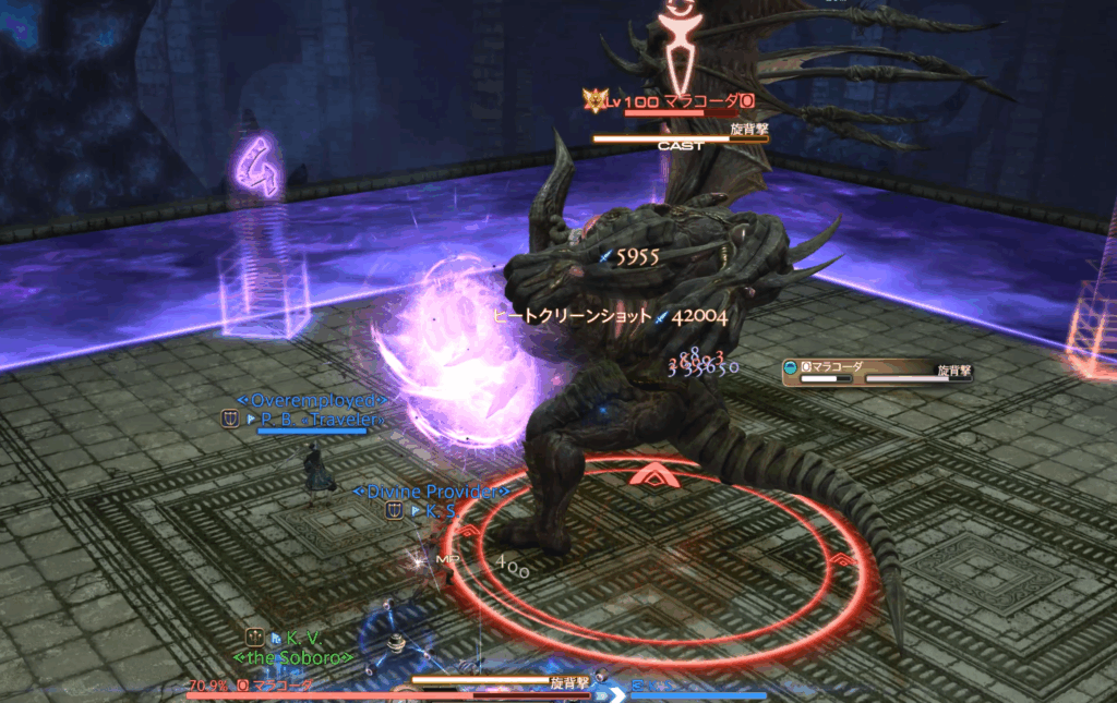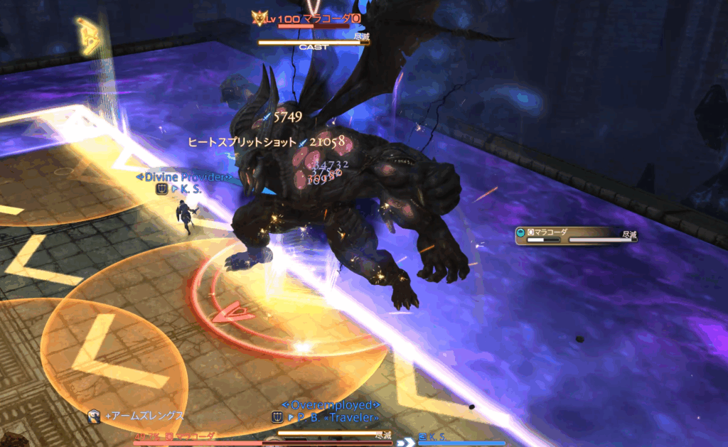 ヒートデバフはAA含む行動で即死ダメを食らうため動かないこと。範囲に巻き込まれた場合、タンク以外は即死。素直にスタンで止めるか、マーカー対象者が視線切りすれば不発に終わる。