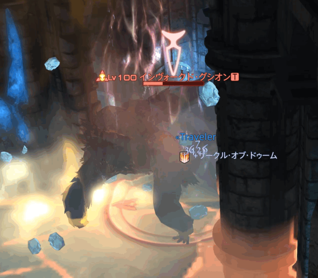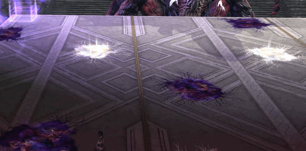 ランダム対象にマーカー付与、消えた地点に直線AoEが来る。そのまま留まると大ダメージを受けるため、移動して避けること。