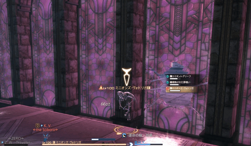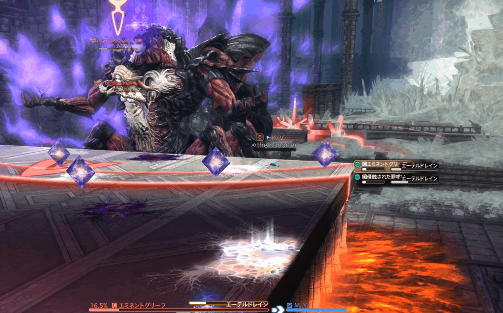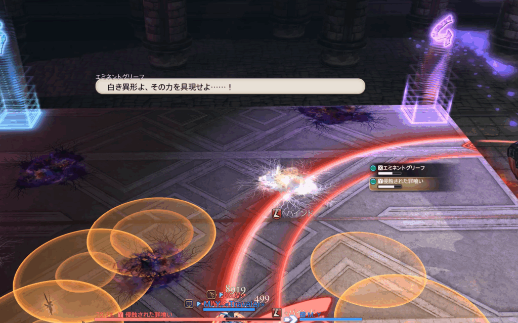 今回のケースでは罪喰いのドレインが先に来るため、闇デバフへ切り替えて無効化。直後に光デバフ床を踏み、エミネントグリーフからのドレインも防がなければならない。